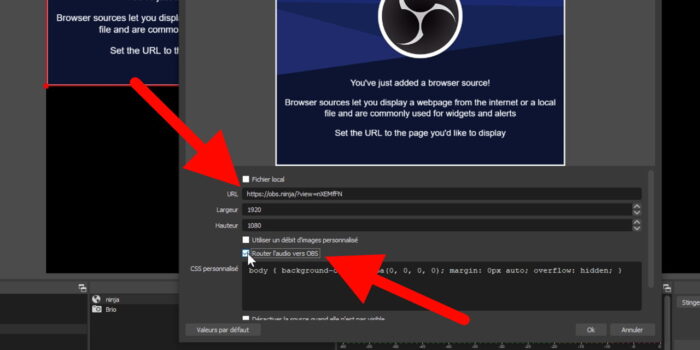 Après avoir ouvert OBS, il suffira d’ajouter une source Navigateur pour faire apparaître la caméra. Donc j’ajoute la source Navigateur, j’en profite pour la mettre aux dimensions de mon canevas, donc chez moi c’est 1920×1080, et je vais recopier l’URL qui m’est donnée par le site VDO.ninja.