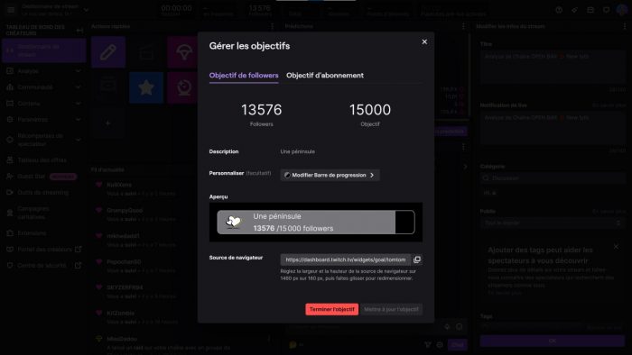 Cliquez sur l’action rapide, et vous pourrez définir un objectif de followers ou un objectif d’abonnement. Entrez votre objectif, éventuellement une description, personnalisez la couleur de la barre de progression, cliquez sur « Valider l’objectif » et il sera désormais visible dans votre bio et on pourra vous suivre ou s’abonner en un clic.