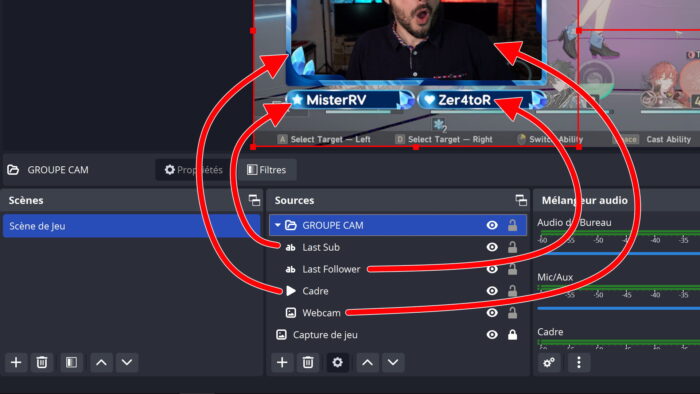 1. Regrouper des sources pour les déplacer en un seul bloc, par exemple la webcam, son cadre, l nom du dernier follower, etc.