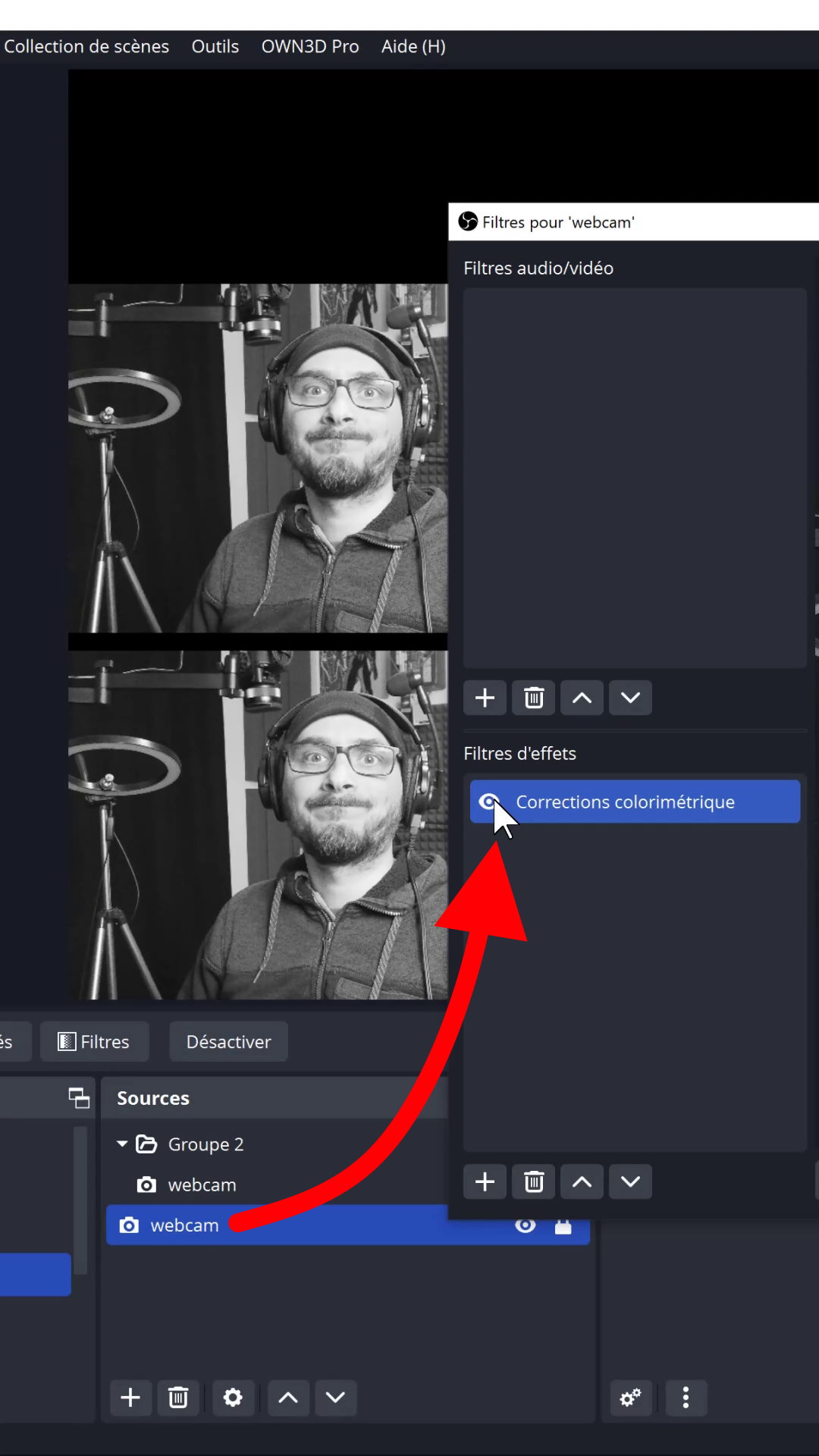 2. Appliquer des filtres directement sur le groupe, ce qui évite de les avoir sur la source en elle-même si on veut la réutiliser dans une autre scène. Exemple avec la webcam :