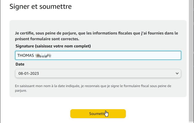 Il ne reste plus qu’Ă signer et soumettre, entrez votre prĂ©nom et votre nom, puis cliquez sur le bouton « Soumettre ».